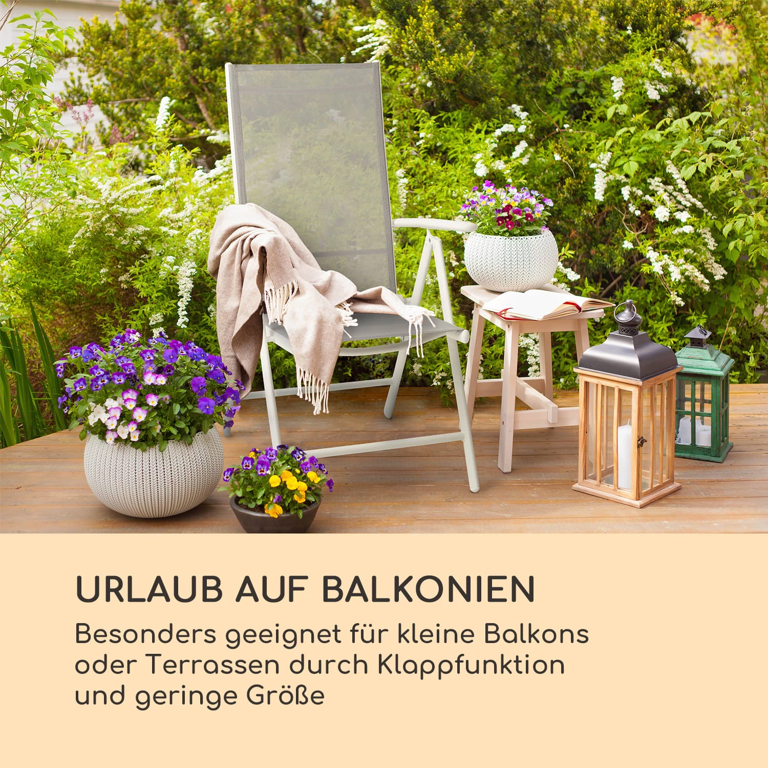 Die Blumfeldt Almeria Garden Chair Klappstühle verschaffen Sitzecken ein Maximum an Flexibilität: Dank der 7-stufig verstellbaren Rückenlehnen können Sie sich am Feierabend entspannt zurücklehnen, um frische Luft und Sonne zu genießen. Oder bequem bei aufgerichteter Lehne mit Freunden und Familie am Kaffeetisch im Grünen sitzen. Die Textil-Bespannungen der Sitzflächen und extra hohen Rückenlehnen sind dank ihrer 2 x 2 Gitterstruktur angenehm luftdurchlässig – ideal für lange Dinner oder Entspannungsstunden. Damit die Witterung keinen Strich durch die Rechnung macht, sind die Bespannungen wasserabweisend und besonders schnell trocknend. Für die Stabilität der Rahmen sorgt robustes Aluminiumrohr mit witterungsbeständiger Pulverbeschichtung. So bleibt die Freude an den Gartenstühlen lange erhalten. Zum Bezug ihres Winterquartiers machen die Blumfeldt Almeria Garden Chair Klappstühle ihrem Namen alle Ehre: Auf platzsparende Maße geklappt, lassen sie sich spielend leicht verstauen. Damit ist es auch ein leichtes, die Sitzecke im Garten für jede Gelegenheit anzupassen: Mehr Stühle, wenn die nächste Feier ansteht und wenige Stühle, wenn Sie nur entspannt allein oder zu zweit den Sommer genießne möchten.