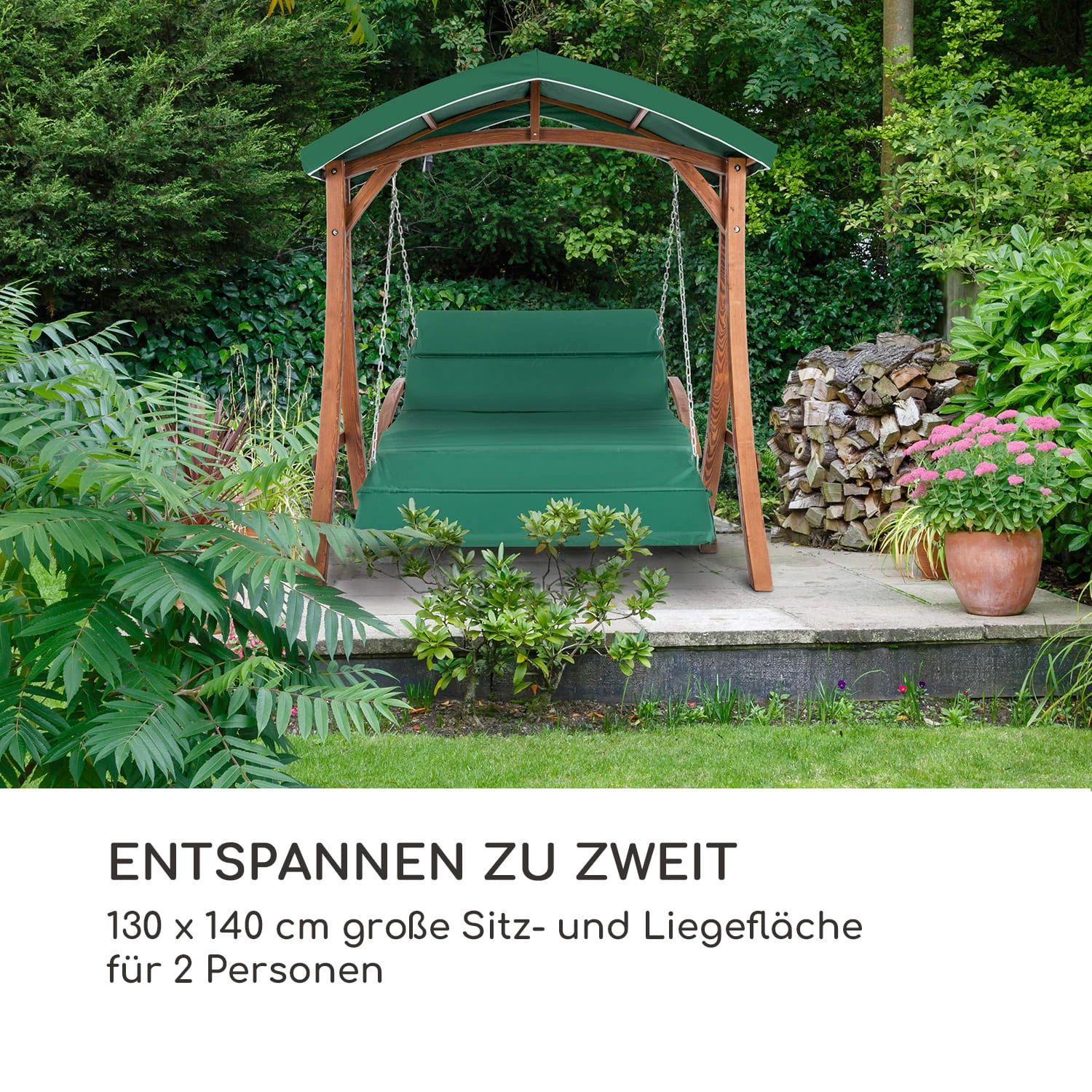 Die Blumfeldt Aruba Hollywoodschaukel macht es ganz leicht, den Alltag zu vergessen. Auf ihrer 130 cm breiten, sanft geschwungenen Sitz- und Liegefläche mit 4 cm dicker Polsterung schaukelt es sich allein oder zu zweit komfortabel wie in einem Liegestuhl. Das mitschwingende, übergewölbte Sonnensegel bringt zusätzliche Geborgenheit und schützt obendrein vor kecken Sonnenstrahlen – egal wo die Schaukel ihren Platz findet. Auch in puncto Standsicherheit bleiben keine Wünsche offen. Massive Holzbalken, vollverzinkte Stahlketten und Schrauben sorgen für eine hochstabile Konstruktion die mit bis zu 250 kg belastbar ist. Das dunkelgrüne Sonnendach und das witterungsfest lasierte Lärchenholz zaubern Sommerstimmung in jede Sitzecke.