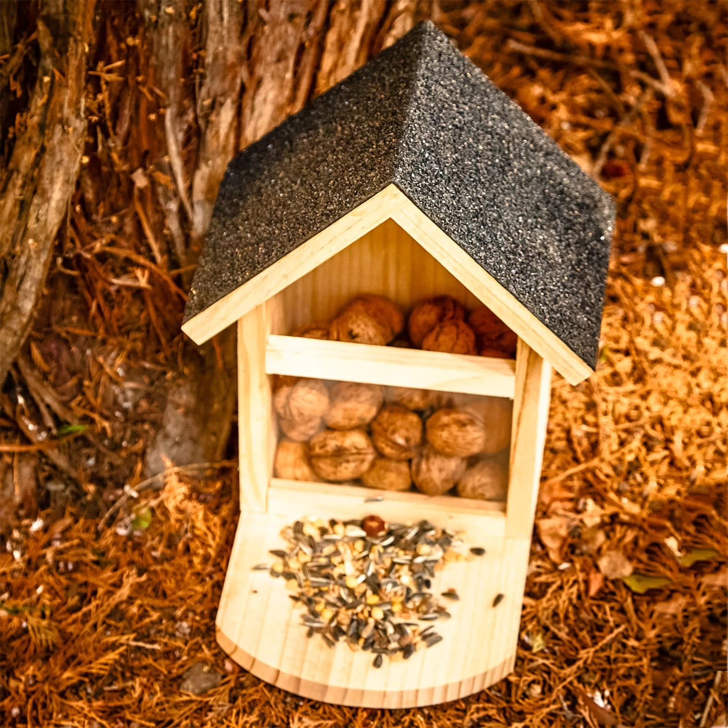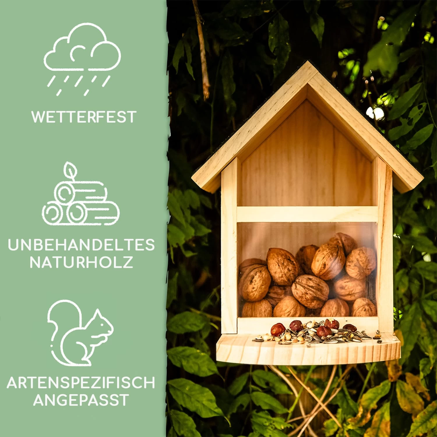Ob Nüsse, Kerne oder Früchte, im blumfeldt Futterspeicher finden Eichhörnchen vor allem im Winter ganz einfach ihr Futter und werden schon bald Schlange stehen. Der Futterkasten aus unbehandeltem Naturholz wird dafür mit Wal- oder Haselnüssen, Sonnenblumenkernen oder Karottenstücken gefüllt, sodass die kleinen Nager auch bei hartem Bodenfrost oder nach trockenen Sommern leicht an Nahrung gelangen können. Das Spitzdach sorgt dafür, dass die Eichhörnchen einen großen Zugang über der Plexiglasscheibe haben und so die Leckereien ganz leicht entnehmen können. Ein sauberer Beschlag aus Bitumenpappe lässt dabei Regen einfach abperlen und schützt das Futterhaus vor Nässe. Wasserstopp und Lüftungslöcher sorgen dafür, dass das Futter lange appetitlich und schimmelfrei bleibt. Die herausnehmbare Plexiglasscheibe lässt leicht den Füllstand des Häuschens erkennen und ermöglicht im Bedarfsfall die einfache Reinigung. Die große Sitzplattform lädt direkt zum Losspeisen ein und bietet dir so eine wunderbare Möglichkeit, die kleinen Tierchen bei ihrem Treiben zu beobachten.