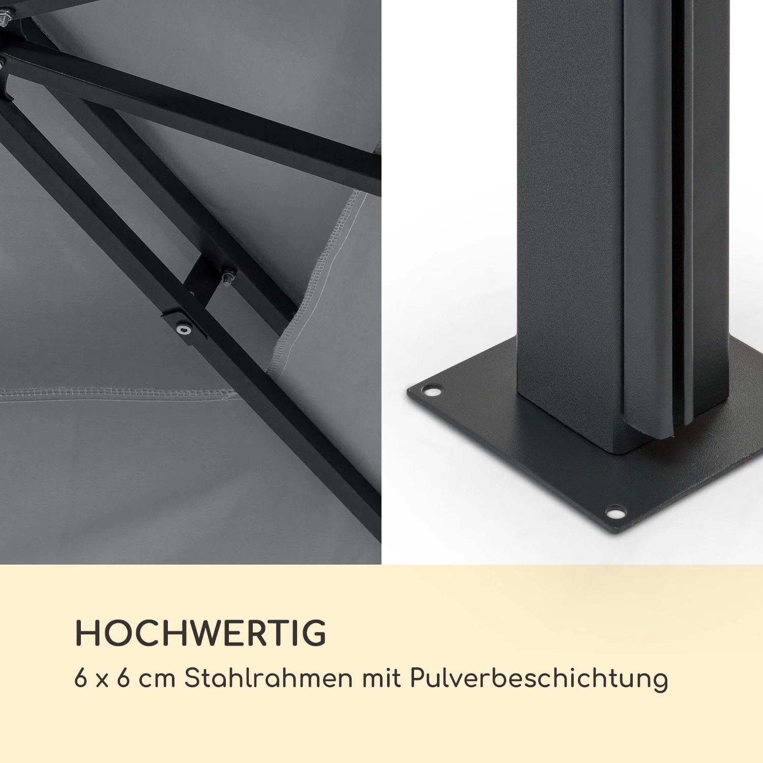 Besonders bei schräger Sonneneinstrahlung, Wind oder Regen kommen die 4 flexiblen Seitenteile zum Tragen, die je einzeln per komfortablem Auf- und Abrollmechanismus geöffnet und geschlossen werden können und aus waschbarem 160 g-Polyester gefertigt sind. Beim Aufbau der Konstruktion ist es ratsam, auf eine besonders senkrechte Verankerung der Standfüße im Boden zu achten, um einen gleichmäßigen und faltenfreien Auf- und Abrollvorgang zu gewährleisten.