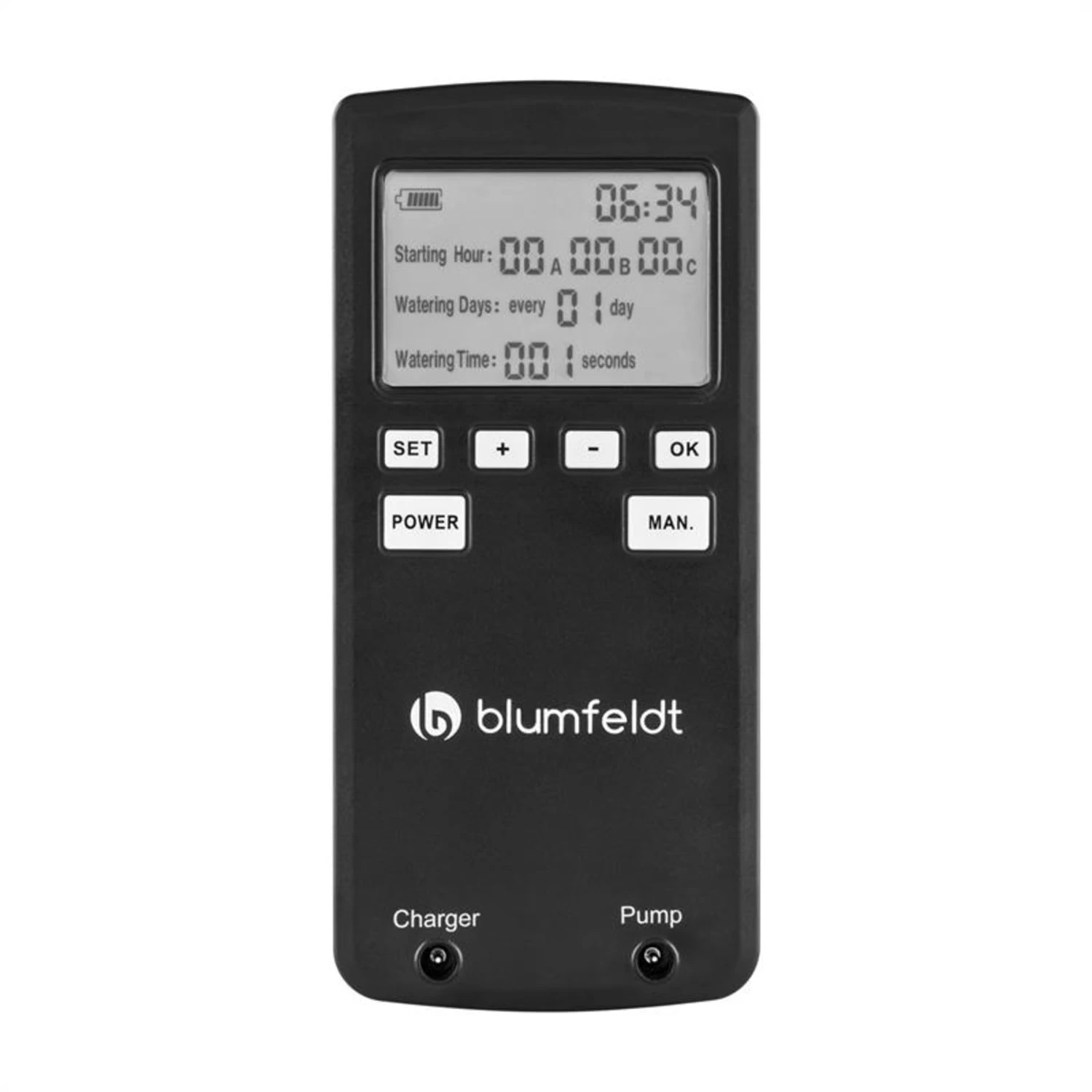 Mit Hilfe des Steuergerätes kann die Urlaubsbewässerung nach individuellen Bedürfnissen programmiert werden. Bis zu dreimal täglich schaltet sich die Pumpe ein und sorgt für eine kurze 15-sekündige Erfrischung bzw. für eine tiefe 10-minütige Bewässerung. Ob täglich oder einmal in der Woche: 1 – 30 Tage stehen als Bewässerungsintervall zur Verfügung.