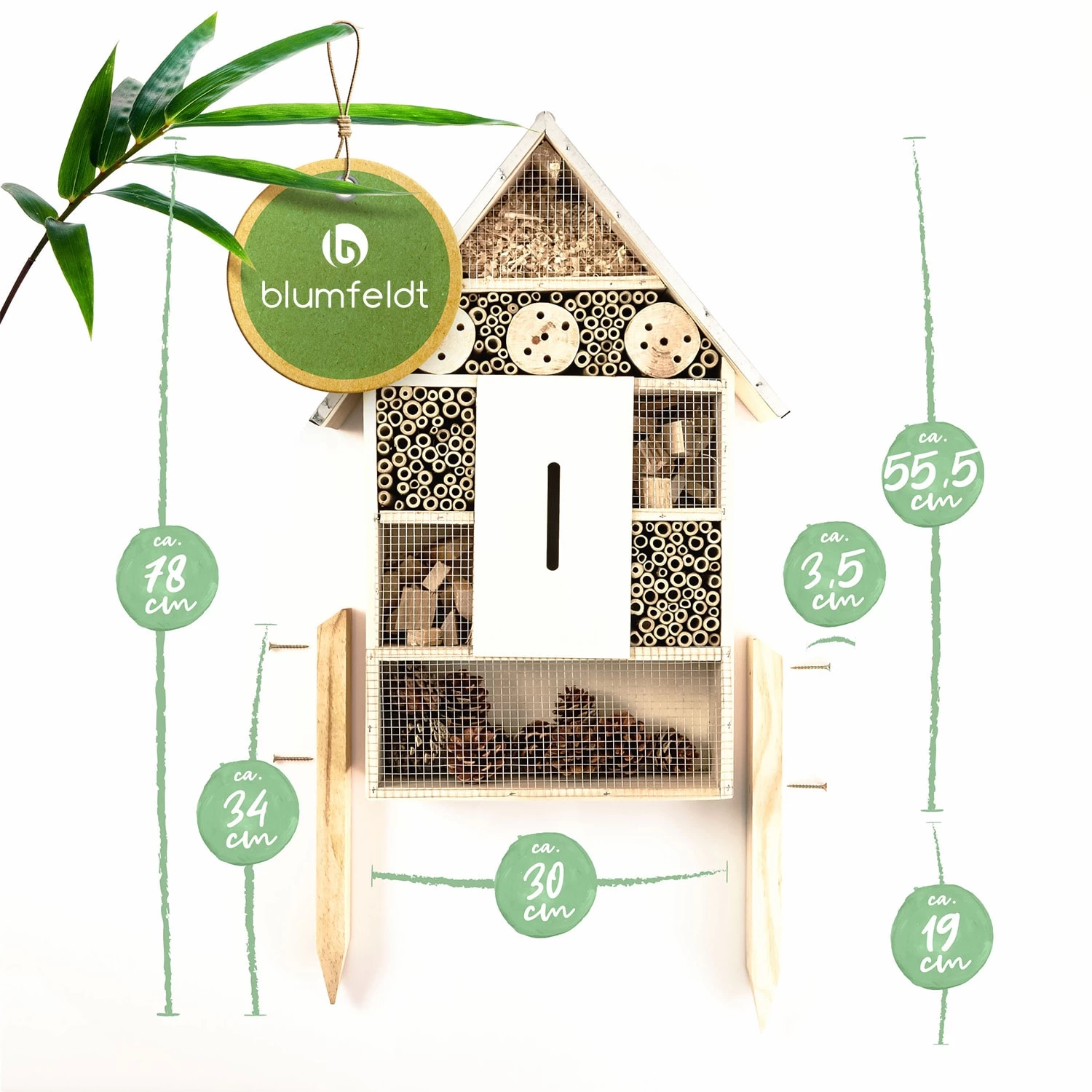 Mit dem Insektenhaus von blumfeldt kannst du viel Gutes tun – für dich, für deinen Garten und für die Umwelt! Das handwerklich gefertigte Nützlingshotel zieht mit seinen vielen Hohlräumen Bienen, Käfer und Fliegen magisch an und bietet ihnen das ganze Jahr über einen willkommenen Rückzugsort. Beobachte, wie die Insekten ein- und ausfliegen und deinen Garten lebendig werden lassen!