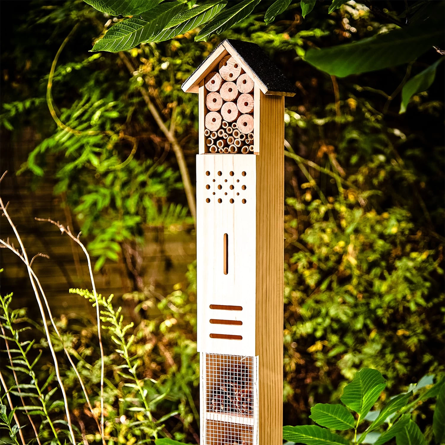 Der handgefertigte Brutkasten besitzt mehrere Hohlräume im Holz und darüber hinaus einige Bambusröhrchen, die sich als Nist- und Schlafplatz für Bienen bewährt haben. Die drei unteren Kammern sind mit Kiefernzapfen, Sägespänen bzw. Holzstückchen befüllt und locken deshalb vor allem Fliegen und Käfer an! In der Mitte befindet sich ein Schmetterlingshaus, welches den Tieren einen geeigneten Rückzugsort bietet.