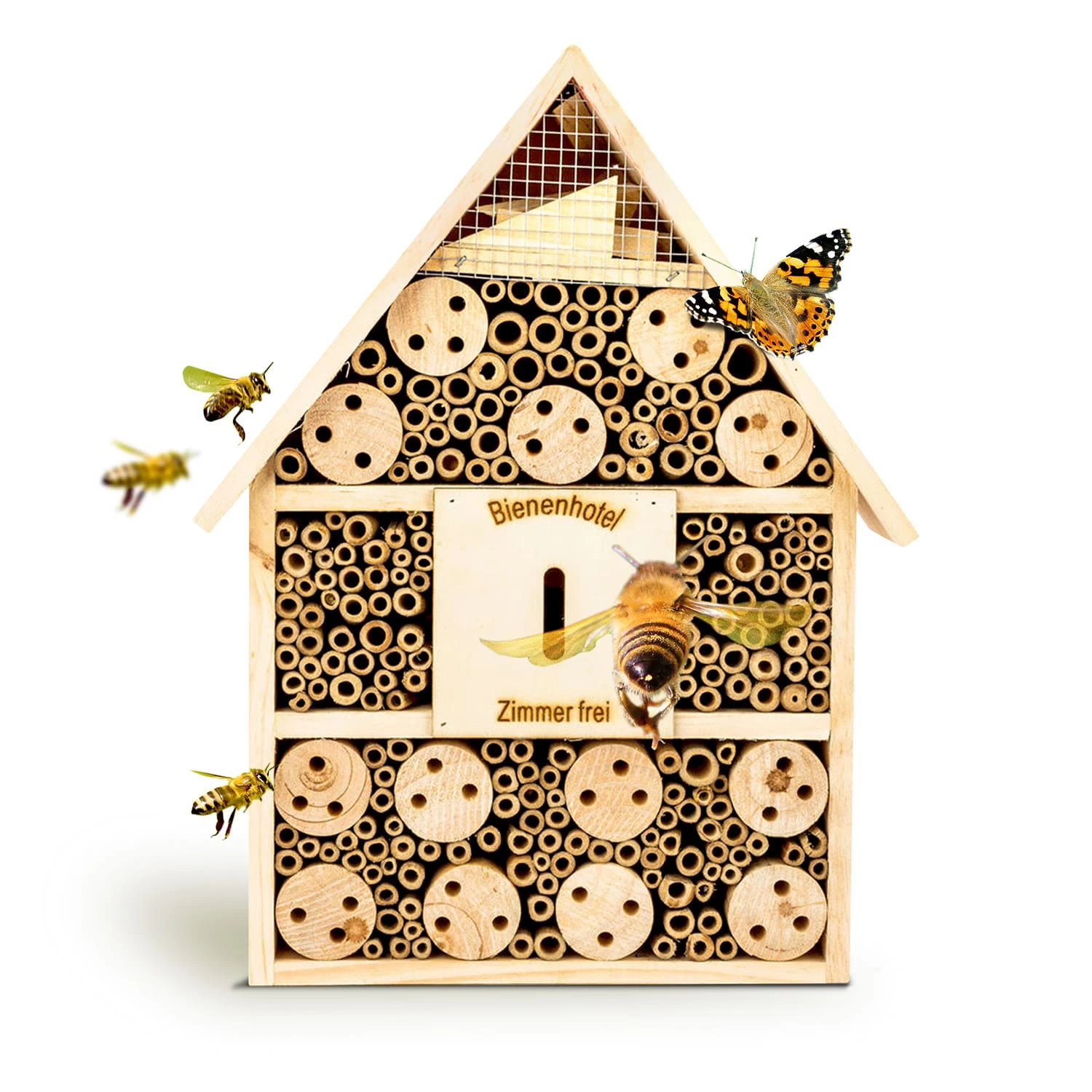 Bienen fühlen sich in dem Insektenhaus dank der vielen Bambusröhrchen besonders wohl. Daneben können sich in den verschiedenen Abteilungen auch Wespen, Schmetterlinge, Marienkäfer, Ohrwürmer, Florfliegen und weitere Nützlinge einnisten. Außerdem ist das Insektenhotel eine tolle Deko im Garten und bietet eine interessante Beobachtungsmöglichkeit für Familien, Kinder, Hobbygärtner und Naturfreunde.