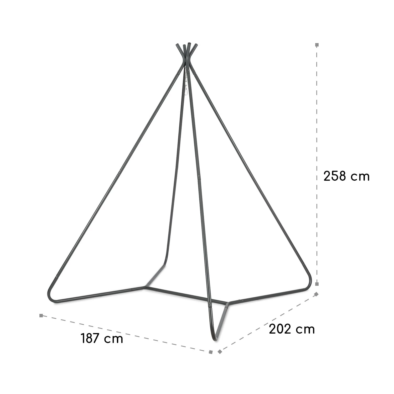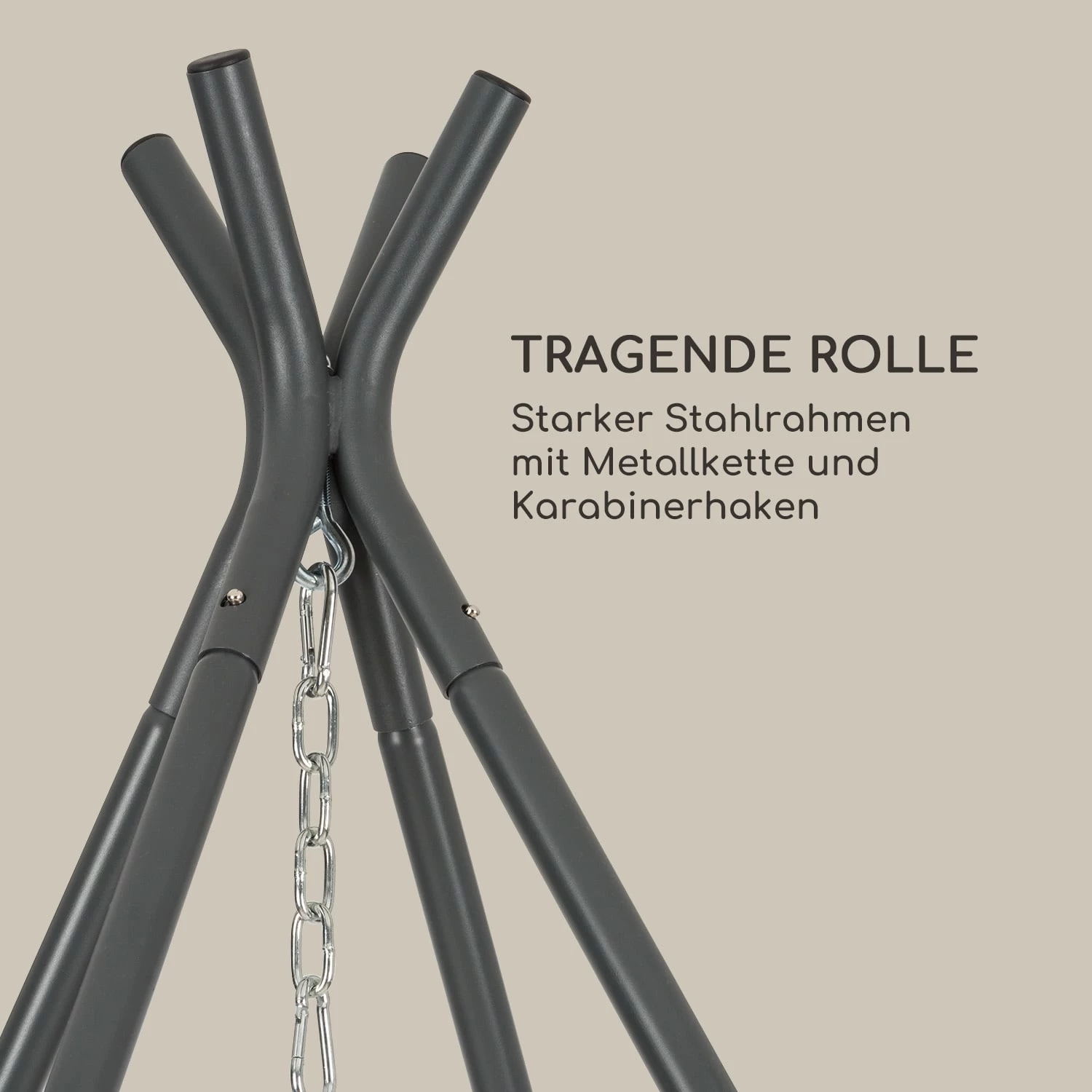 Der robuste Ischia Hängesitz-Rahmen ist dank seiner 3,2 Ø cm dicken Stahlrohre sehr stabil und kann problemlos bis zu 300 kg Gewicht tragen. Durch seine verzinkten Rohre und die Pulverbeschichtung ist er wetterbeständig und für den Außeneinsatz bestens vorbereitet. Zusätzliche Sicherheit verleiht die vierbeinige Konstruktion, die das Gerüst vor dem Umkippen schützt. Durch das Steck-System ist der Aufbau im Nu vollbracht und erfordert kein zusätzliches Werkzeug. Abgerundet wird das Hängesitz-System durch eine starke Metallkette und einen Karabinerhaken, die das Aufhängen von Hängesitzen zum Kinderspiel machen.