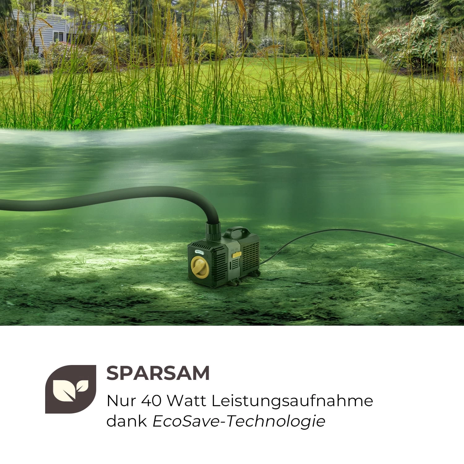 Mit der Waldbeck Lagoon 5200 Teichpumpe erhalten Sie einen leistungsstarken Wasserförderer mit flexiblem Einsatzhorizont. Dank EcoSave-Technologie und einem sehr geringen Verbrauch von gerade einmal 40 Watt je Stunde ist sie der ideale, stromsparende Helfer bei der dauerhaft notwendigen Wasserumwälzung in Bachläufen und Fischteichen. Mit einer Förderung von bis zu 5.200 Litern pro Stunde bewegt sie auch große Wassermengen, was die notwendige Sauerstoffzufuhr in Teich oder Bachlauf sicherstellt. Darüber hinaus ist sie in der Lage, Partikel bis zu 6 mm Größe mit dem Wasser zu fördern und kann so als wichtiger Bestandteil eines Filtersystems arbeiten, um gerade Fischteiche von Verunreinigungen zu befreien – was Kois und Goldfische danken werden. Ein Filterkorb verhindert, dass Laub, Wasserpflanzen oder -bewohner in die Bachlaufpumpe gesaugt werden.