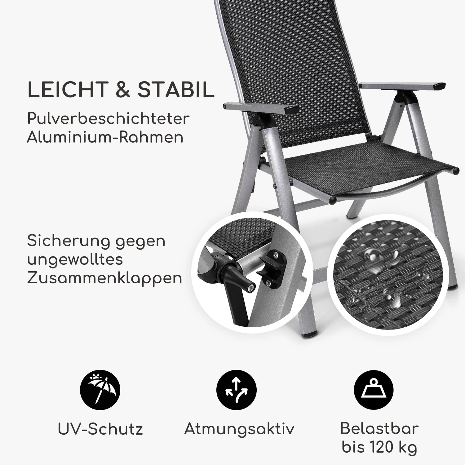 - Sitz- und Rückenfläche aus wetterfestem, strapazierfähigem Textilene