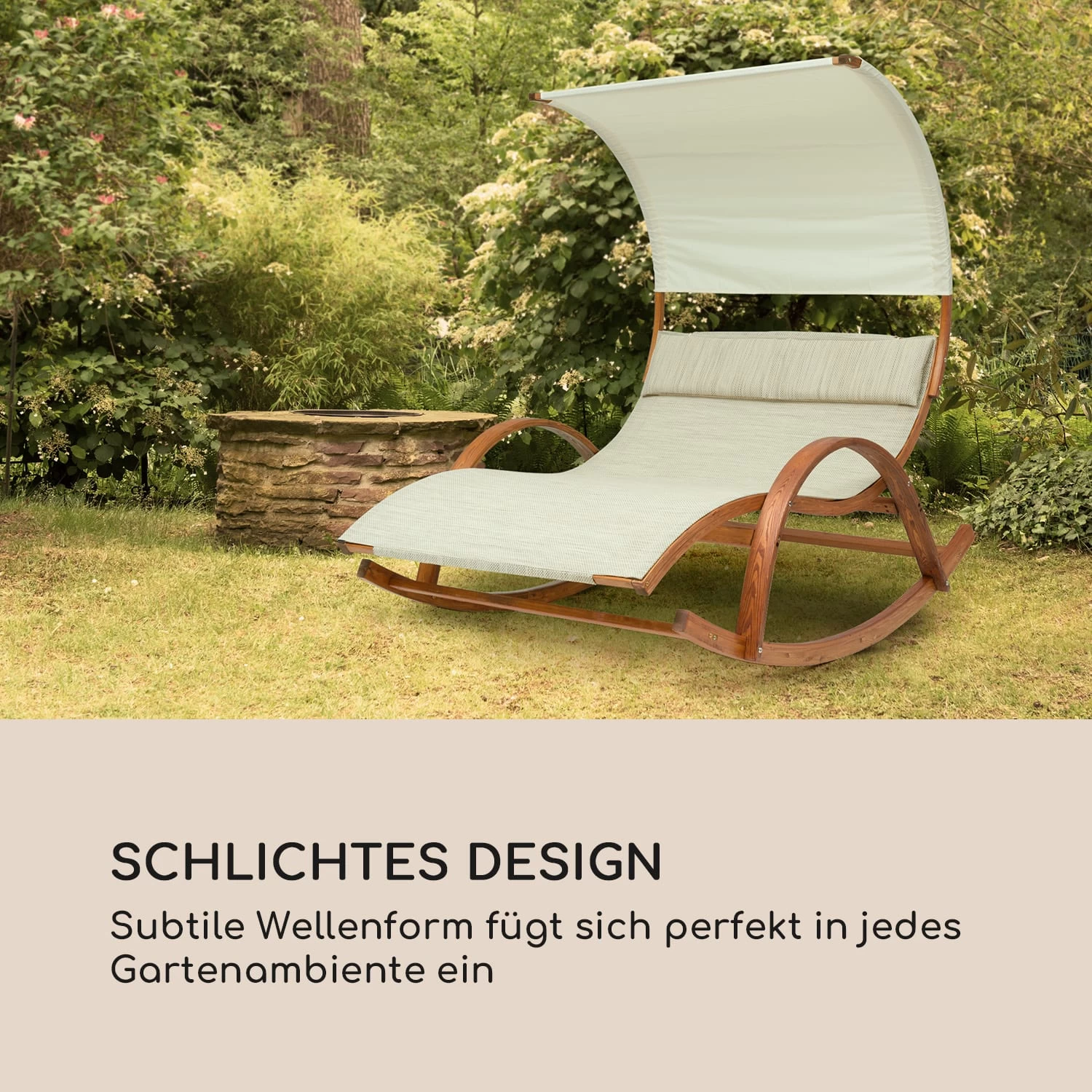 An heißen Sommertagen bietet das einfach zu verstellende Sonnendach aus Polyester verlässlichen UV- und Sonnenschutz. Darüber hinaus unterstützt der ergonomisch geformte Liegebereich die natürliche Form der Wirbelsäule und bietet eine Entspannungsfläche aus bequemem ComfortMesh, das nicht nur luftdurchlässig und wetterbeständig, sondern durch seine pflegeleichte Textilstruktur auch besonders einfach zu reinigen ist. Der stabile Rahmen aus finnischem Kiefernholz wird durch seine wasserfeste Lasur zuverlässig vor äußeren Einflüssen geschützt und ermöglicht eine maximale Belastbarkeit von 180 kg. Die sanft schaukelnde Ruhestätte fügt sich durch ihr wellenförmiges Design perfekt in jedes Gartenambiente ein und beeindruckt durch seine schlichte Eleganz.