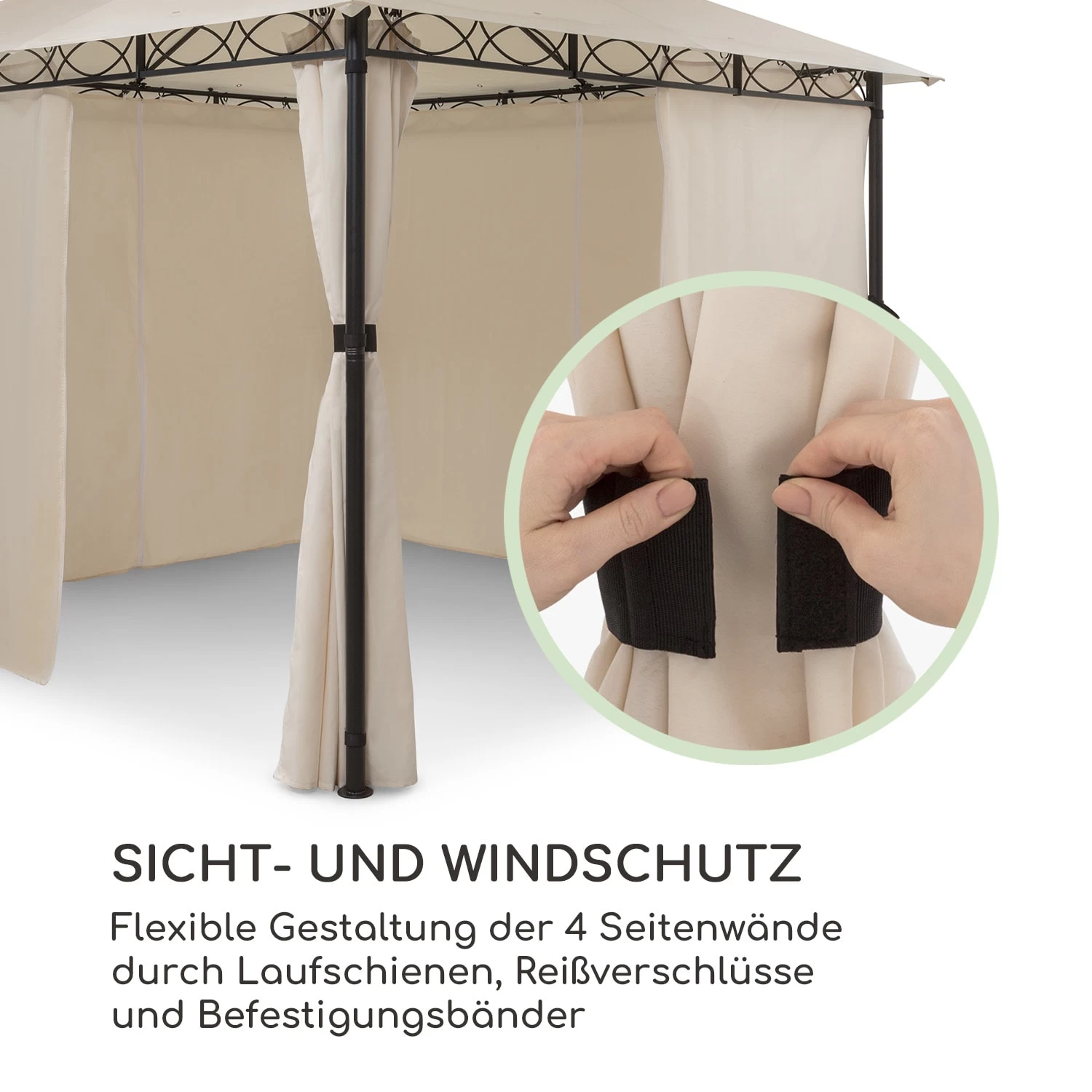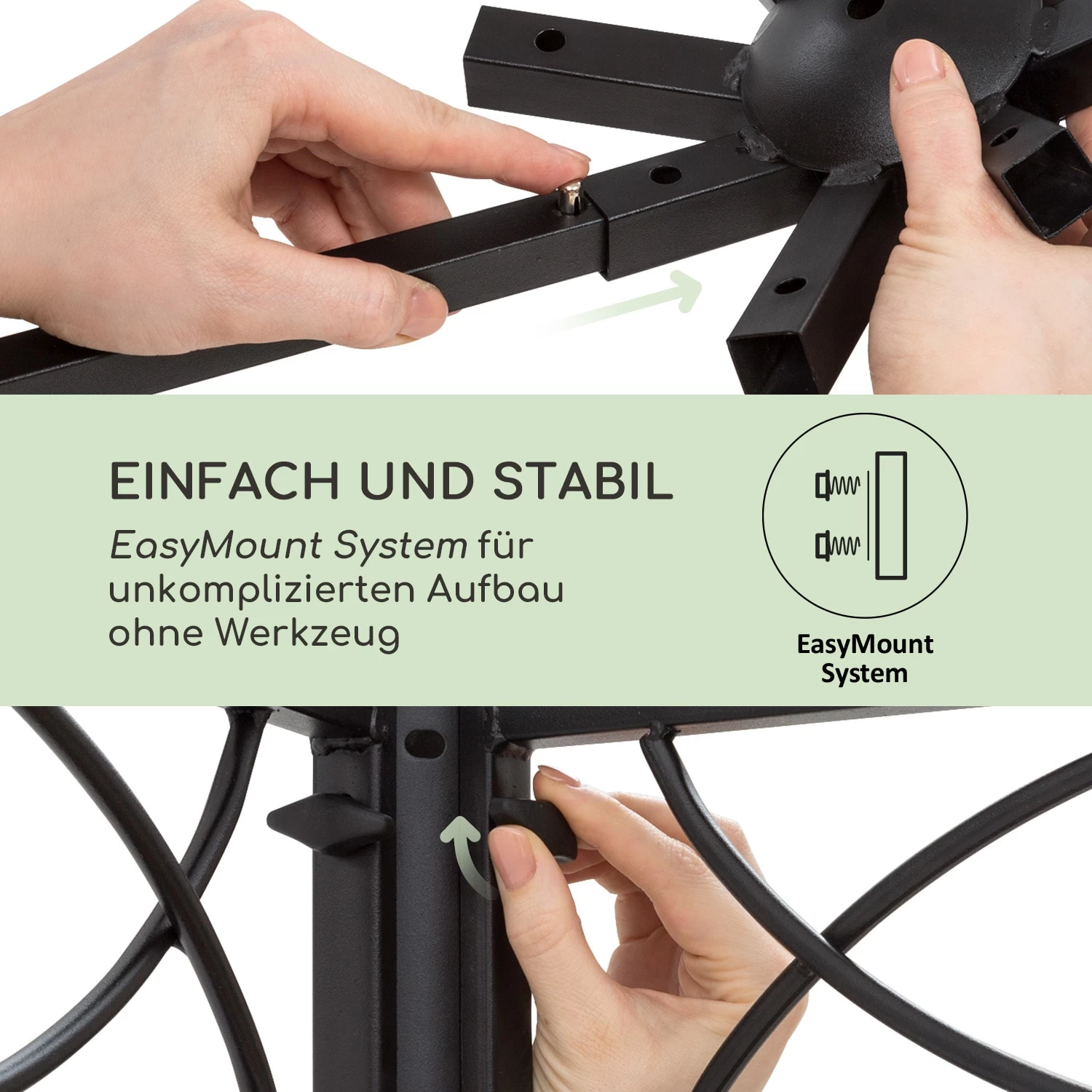 Schön, stabil und flexibel, so muss ein Gartenpavillon sein, damit der Sommeraufenthalt im Garten zum Erlebnis wird. Das Blumfeldt Mondo Partyzelt wird diese Erwartungen übertreffen: Das knapp 3 x 3 m große Gartenzelt macht mit seinem abgeschrägten Dach, den dekorativen Metallornamenten und seinen dezenten Seitenwänden nicht nur eine gute Figur. Seine Konstruktion aus pulverbeschichtetem Stahlrohren verleiht ihm hohe Stabilität. Dabei glänzt es schon beim Aufbau mit seinem EasyMount Concept: Komplett ohne Werkzeug werden die Klick-Verbindungen ineinander eingerastet und ermöglichen so einen schnellen, unkomplizierten und stabilen Aufbau. Für besten Schutz in allen Lagen sorgen das einteilige Dach und die vier flexiblen Seitenwände aus Polyester. Eine Polyacryl-Beschichtung macht das Textil Wasserabweisend und verleiht ihm zusätzlichen UV-Schutz. So hat Regen gleich zweifach keine Chance die gute Laune zu trüben: An den schrägen Dachflächen aus 180g/m² Polyester perlt und fließt Wasser einfach ab. Laufschienen und Reißverschlüsse zum Verbinden geben bei den Seitenwänden ein Maximum an Gestaltungsmöglichkeiten – genau richtig, um Licht und Luft hereinzulassen oder kühle Brisen und neugierige Blicke draußen zu halten.
