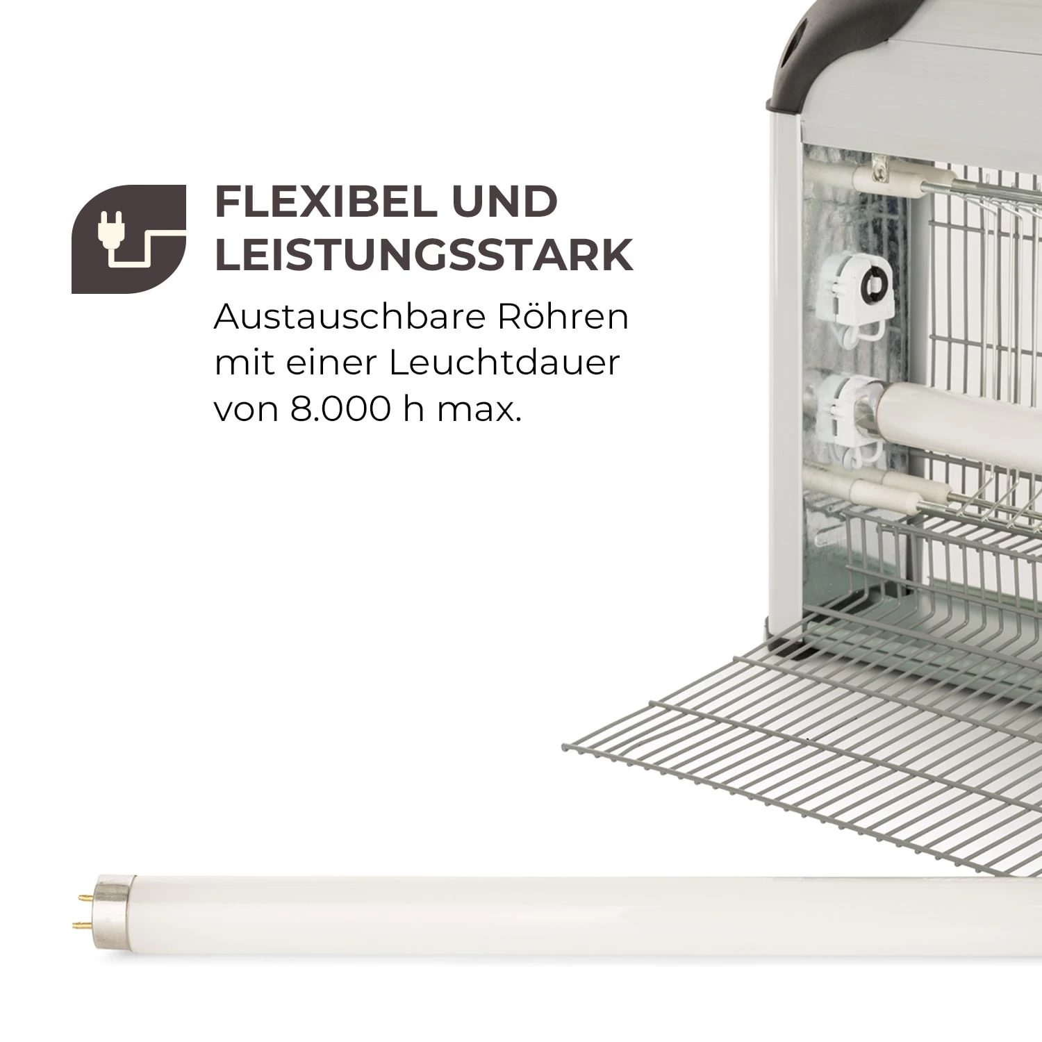 Mit dem Waldbeck Mosquito Ex 4000 Insektenvernichter halten Sie sich rund um die Uhr schwirrende Futterneider und stechfreudige Blutsauger vom Leib. Das 30 Watt starke Gerät lockt Ungeziefer durch seine unwiderstehliche geräusch- und geruchlose Ausstrahlung herbei: 2 x 10 Watt leistungsstarke Röhren geben ultraviolettes Licht an ihre Umgebung ab und ziehen dadurch Insekten in der unmittelbaren Umgebung an. Ein hochwertiges Drahtgitter im Inneren der Insektenfalle versetzt den Angelockten einen 2500 V starken tödlichen Stromschlag und macht somit den Einsatz toxischer Chemikalien und Substanzen überflüssig. Durch einen Wirkungsbereich von 100 m² ist der praktische Helfer bestens für verschiedenste Innenbereiche wie Wohnungen, Küchen oder auch Ställe geeignet. Sämtliche getöteten Insekten fallen in eine abnehmbare Auffangschale, die einfach aus dem Gerät herausgelöst und gereinigt werden kann. Auch die Schutzgitter, die von Außen den Kontakt zu den Stromdrähten verdindern, können bequem abgenommen und gewaschen werden. Zur sicheren Platzierung der Falle außerhalb der Reichweite von Kindern und Haustieren dient zudem eine praktische Aufhängevorrichtung, die mit Hilfe einer mitgelieferten Kette in der gewünschten Höhe angebracht werden kann.