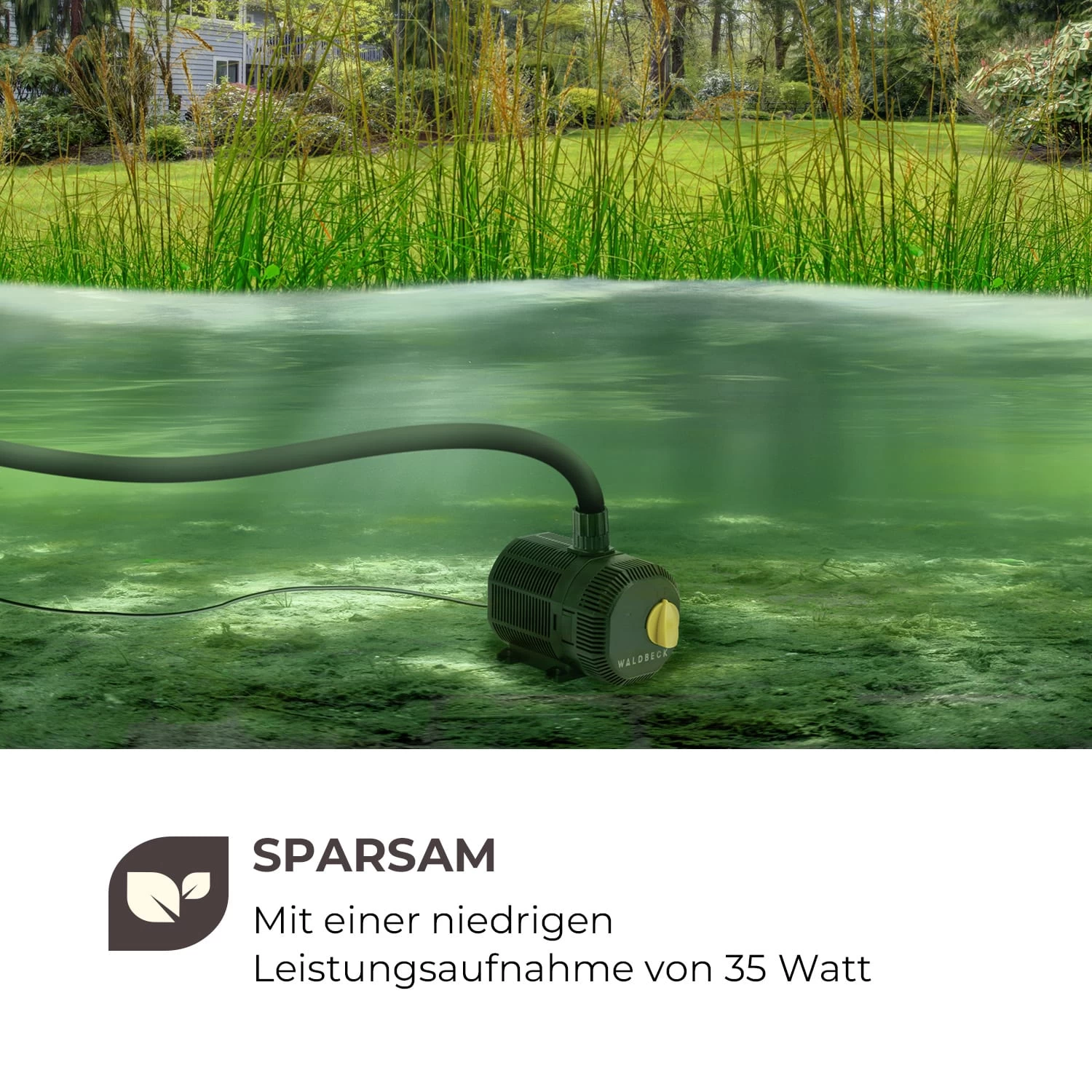 Durch einen sparsamen Verbrauch ist die Pumpe der ideale Helfer bei der dauerhaft notwendigen Wasserumwälzung in Bachläufen und Fischteichen. Auch zum Betrieb eines kleinen Springbrunnens oder zur Förderung von Wasser aus Regentonnen ist die Nemesis T35 bestens geeignet. Mit ihrer Förderung von bis zu 2300 Litern pro Stunde bewegt sie große Wassermengen und kann somit die notwendige Sauerstoffzufuhr im Gewässer sicherstellen. Für den einfachen Anschluss liefert die Teichpumpe ein Adapterset inklusive Dichtungsring mit, das die Verbindung mit 3/4“- und 1“-Schläuchen ermöglicht. Zur einfachen Reinigung des Pumpensystems verfügt die Waldbeck Nemesis T35 über ein Schnellentriegelungssystem, um sie mit wenigen Handgriffen zu zerlegen. Ein Filterkorb verhindert zudem, dass Laub oder Wasserpflanzen ins Innere der Teichpumpe gelangen können. Für einen festen Stand sorgen 4 Gummistandfüße und die Sicherheit ist dank Schutzklasse IPX8 jederzeit gewährleistet.