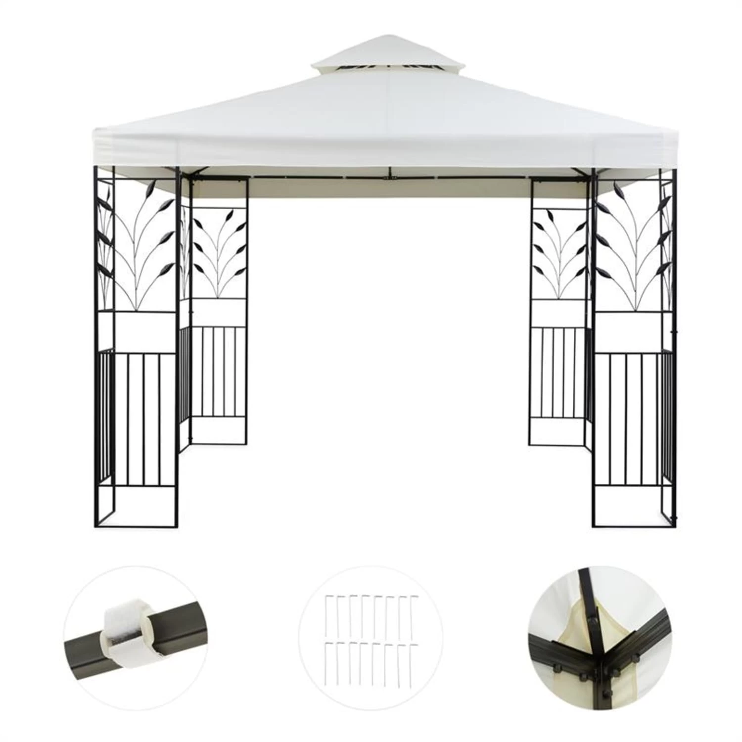 Schön, stabil und flexibel, so muss ein Gartenpavillon sein, damit der Sommeraufenthalt im Garten bei Tag und Nacht zum entspannten Erlebnis wird. Das Blumfeldt Odeon Partyzelt wird Ihre Erwartungen übertreffen: Das 3 x 3 m große Gartenzelt macht mit seinem abgeschrägten Dach, den dekorativen Metallornamenten im Blumendesign nicht nur eine gute Figur. Seine Konstruktion aus pulverbeschichteten Stahlrohren verleiht ihm hohe Stabilität und eine lange Lebensdauer. Zusätzlichen Halt am Boden verschaffen die mitgelieferten Heringe. Auch Regen hat keine Chance Ihre gute Laune zu verderben: An den schrägen Dachflächen aus 180 g/m² Polyester perlt und fließt Wasser dank wasserabweisender PA-Beschichtung einfach ab.