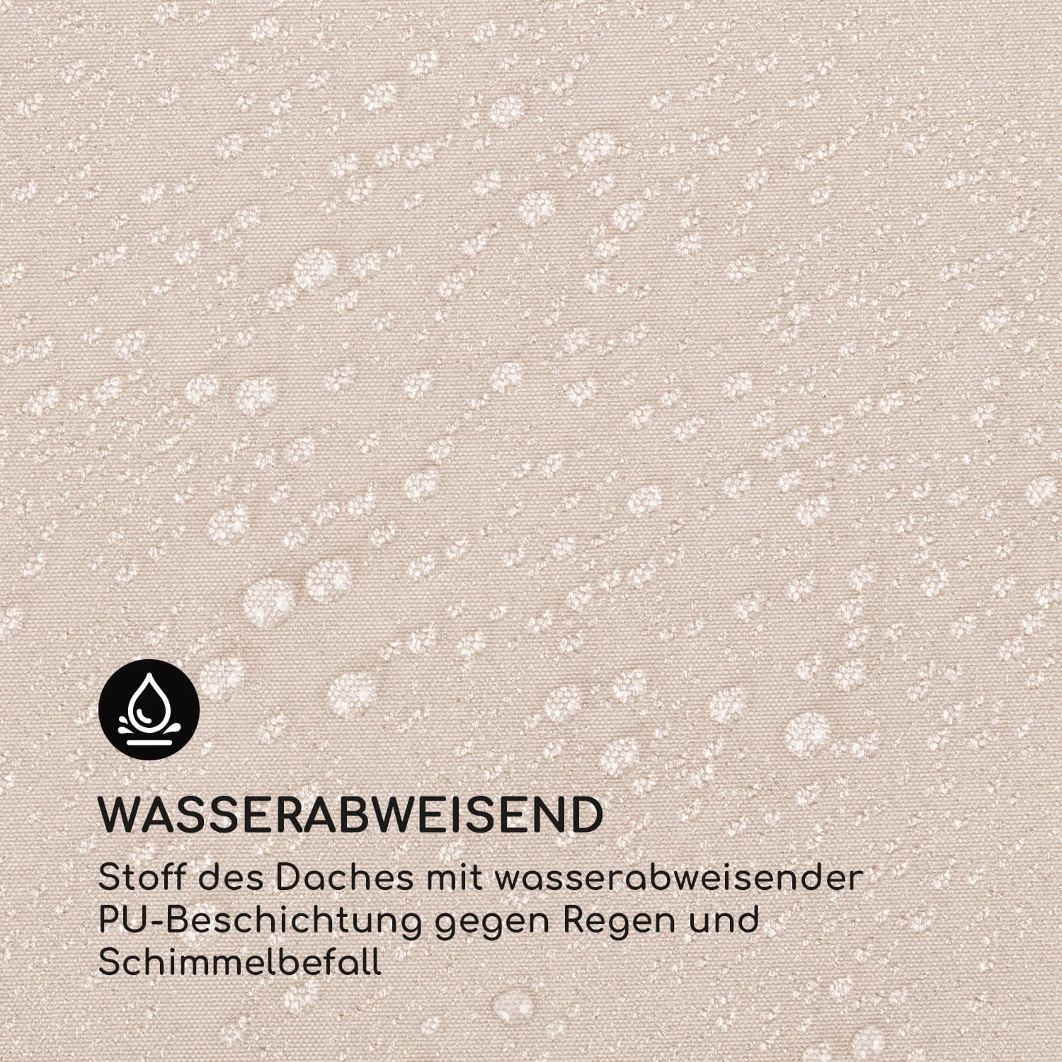 Mit dem stufenlos raffbaren Stoffdach aus 180 g/m² Polyester erhältst du die volle Kontrolle über Schatten und Sonne. Der Seilzug lässt das Sonnendach des Pavillons in seinen Führungsschienen geschmeidig vor- und zurückgleiten, die wasserabweisende Beschichtung schützt vor Schimmel und kurzen Regenschauern. Durch die flexibel auf- und abrollbaren Seitenteile aus 160 g/m² Polyester-Stoff bleibst du die ganze Zeit windgeschützt.