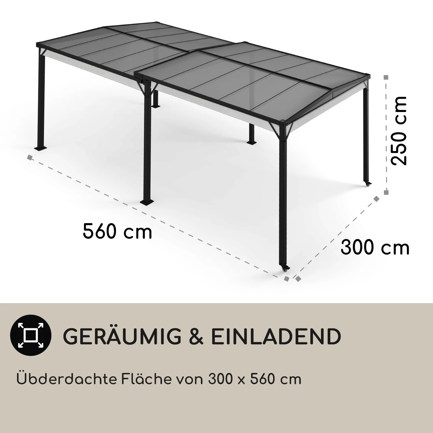 Für besten Schutz in allen Lagen sorgt das leicht schräge Dach aus 6 mm starken, wasserabweisenden und leicht getönten Polycarbonat-Platten. So hat Regen gleich zweifach keine Chance, die gute Laune zu trüben. Dank seiner Pfosten mit Rollen kannst du die Größe flexibel, einfach und individuell anpassen. Optimal kannst du den Pavillon auch als Carport oder Unterstand für Fahrräder, Gartengeräte oder -werkzeug nutzen.