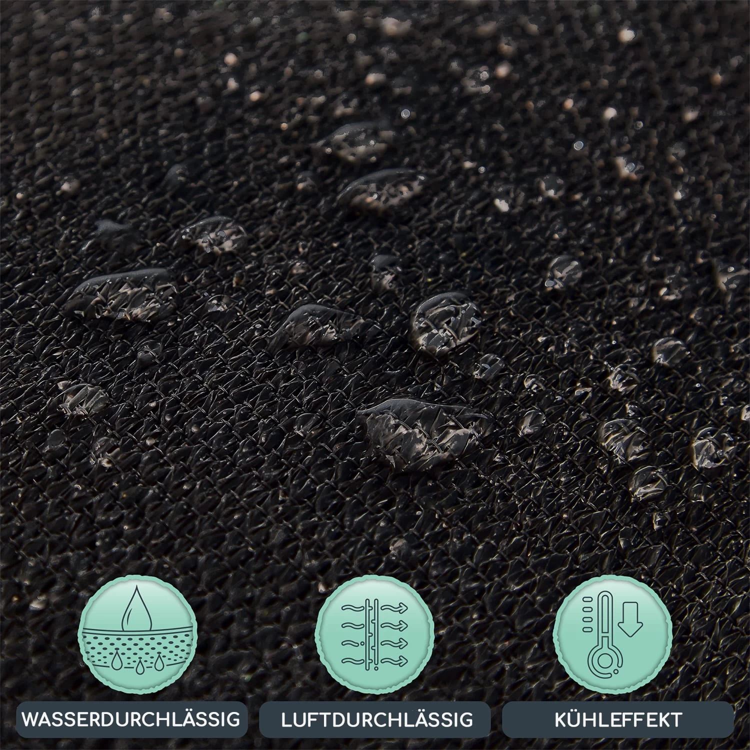 Dank der rostfreien Ringe aus Edelstahl ist die Befestigung sehr unkompliziert. Ziehe einfach die Seile durch die Befestigungsringe, welche du in der Umgebung beliebig anbindest. Für eine dauerhafte Anbringung empfehlen wir dir, anstelle der Seile, Spann- oder Karabinerhaken zu verwenden. Dank des reißfesten und strapazierfähigen Polyester-Materials kannst du das Sonnensegel sehr straff und glatt aufspannen. Zudem ist das Material sehr luftdurchlässig, was dafür sorgt, dass sich unter dem Dach keine Hitze staut. Das Segel hält den Regen ab und ist zudem sehr belastbar, durch festes Material, hochwertige Verarbeitung und doppelte Nähte.