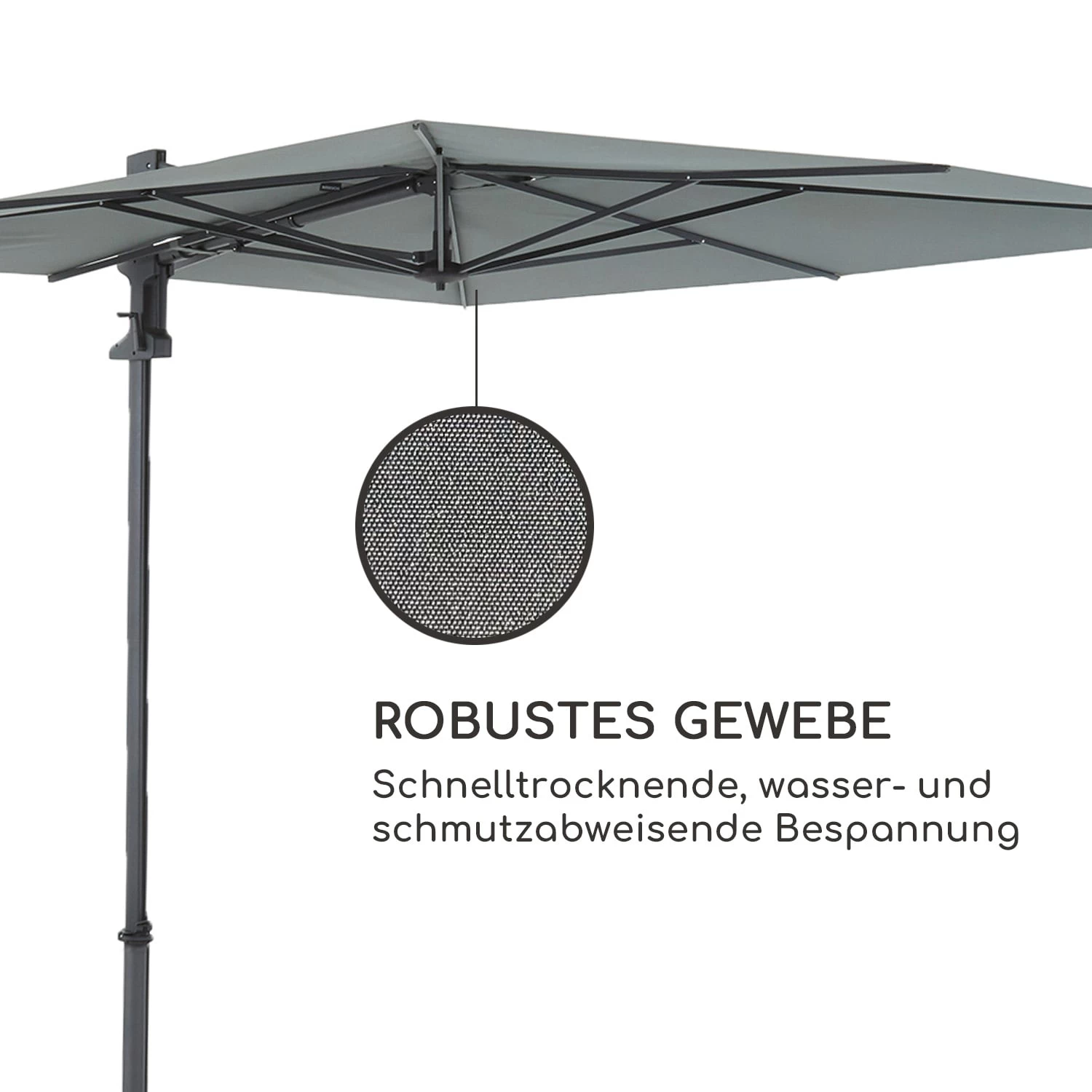 Sonnenschutz im Garten oder auf der Terrasse egal wo die Sonne steht? Mit dem blumfeldt Saint-Tropez Ampelschirm bist du dank 3-Achsen-Rotation bestens vor UV-Strahlung geschützt. Sein Fuß ermöglicht eine 360°-Drehung und das rechteckige Sonnensegel kann bequem sowohl seitlich als auch vorwärts und rückwärts gekippt werden. Somit richtest du den Schirm immer ideal zum aktuellen Sonnenstand aus, ohne ihn versetzen zu müssen. Die Bespannung besteht aus Polyamid und ist natürlich wasser- und schmutzabweisend, darüber hinaus liegt der UV-Schutzfaktor bei 50+ und schützt dich ausgezeichnet vor direkter Sonneneinstrahlung. Das Gestell des Saint-Tropez Sonnenschirms ist aus rostfreiem Aluminium, das mit einer Pulverbeschichtung überzogen ist. Hinter den stabilen Verstrebungen in der Schirmmitte findet sich ein praktisches Windventil für eine optimale Luftzirkulation.