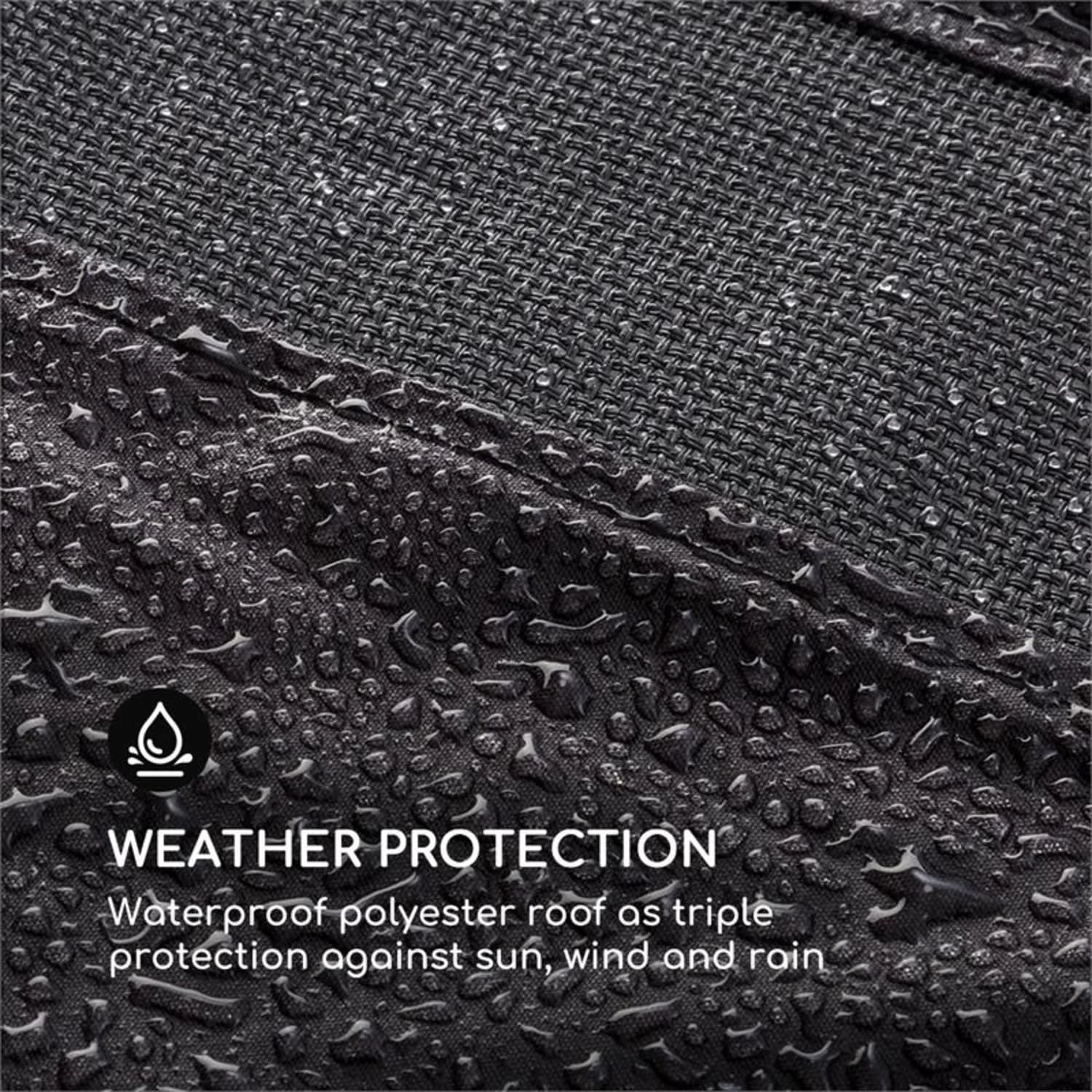 Vor allem an sonnigen Tagen, lassen sich unter dem Schutz viele entspannte Stunden im Schatten verbringen. Dank der wasserdichten Beschichtung weist die Oberfläche Wassertropfen außerdem zuverlässig ab.Natürlich lässt sich das Dach bei Bedarf auch ganz einfach waschen.