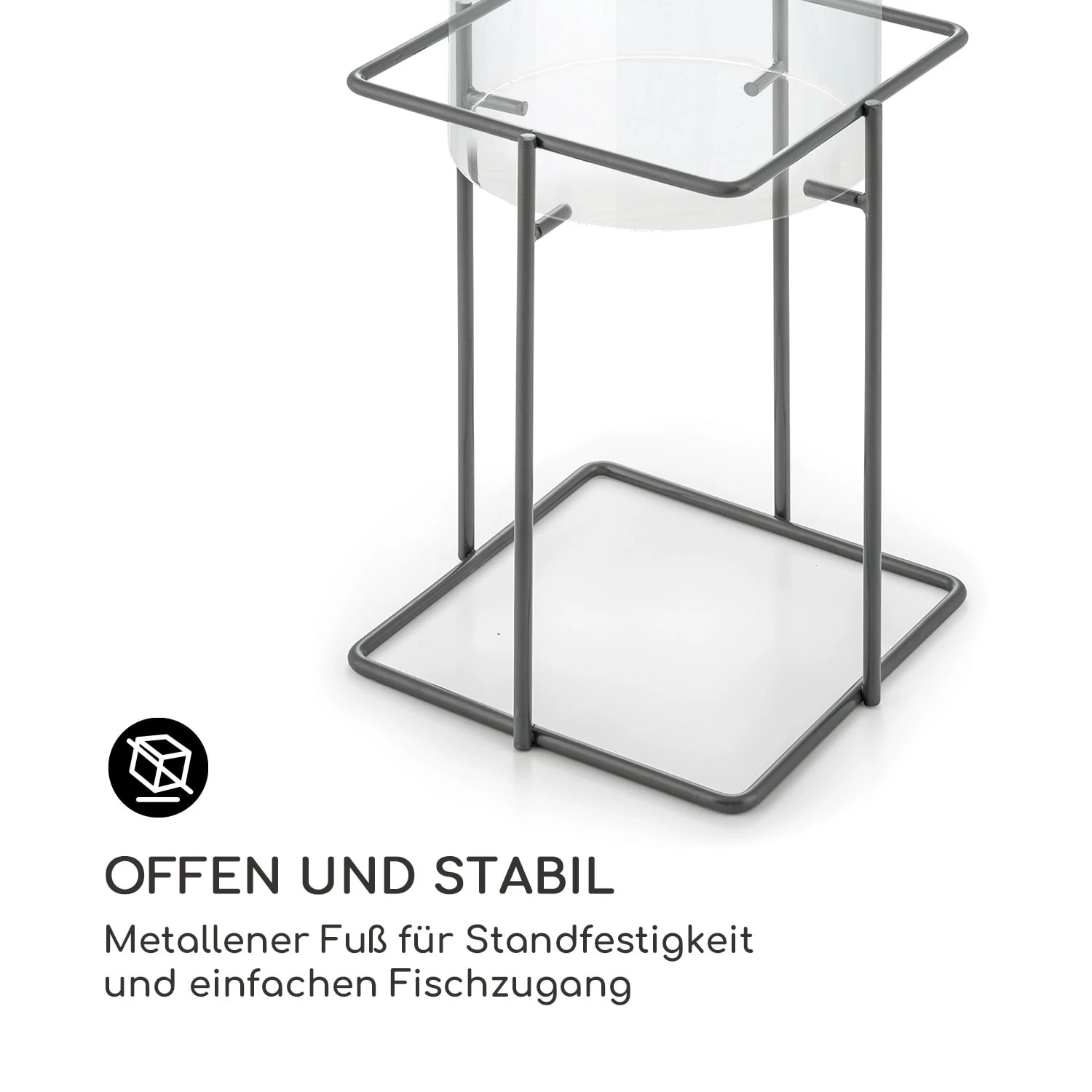 Der große Acrylglas-Zylinder mit seiner 3 mm dicken Wand wird zum neuen Zentrum in deinem Gartenteich. Lass die Physik für dich arbeiten: Ohne zusätzliche Geräte wird mittels Vakuums das Wasser im Turm über die Teichoberfläche gehoben und bietet dir so einen glasklaren Blick auf deine schuppigen Lieblinge. Das Prinzip ist ganz simpel: Die Sonne erwärmt das Wasser im Fischturm und lockt so deine Fische nach oben. Die 87 cm hohe Säule mit einem Durchmesser von 20 cm gewährt deinen Fischen ausreichend Bewegungsfreiheit. Der metallene Fuß sorgt für einen sicheren Stand und bietet deinen Fischen viel Platz zum Hineinschwimmen. Der Vergrößerungseffekt des blumfeldt Skydive 60 Fischturms zaubert einen tollen und klaren Blick auf das Geschehen. Das Acrylglas ist witterungs- und UV-beständig. Des Weiteren sind die Inbetriebnahme und die Reinigung sehr einfach.