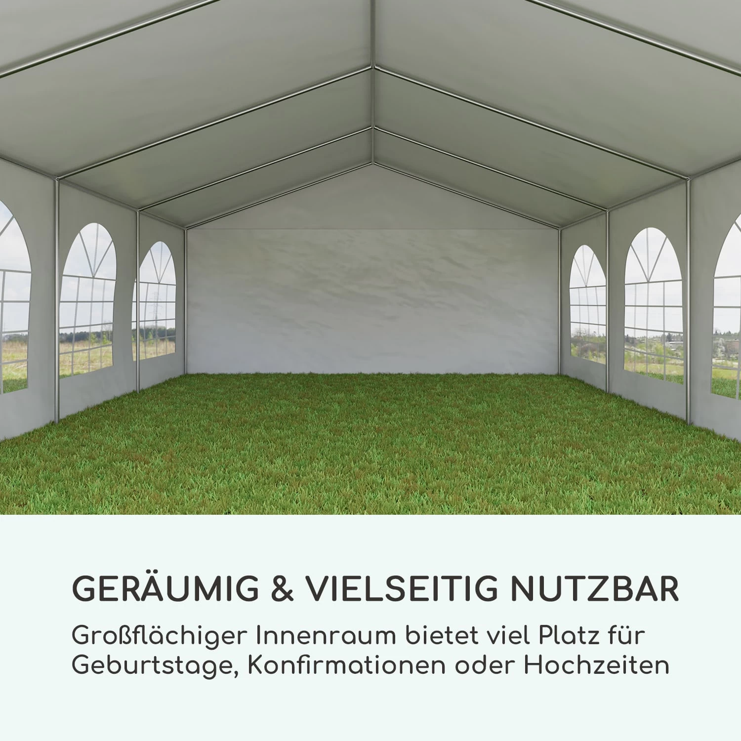 Egal ob für Gartenfeten, große Gesellschaften oder Veranstaltungen, das Sommerfest Zelt von blumfeldt bietet für jeden Anlass einen stabilen Wetterschutz und einen angenehmen Aufenthaltsraum im Freien. Es eignet sich außerdem auch ideal für temporäre Lagerzwecke von beispielsweise Schwimmbecken und Außenpools.